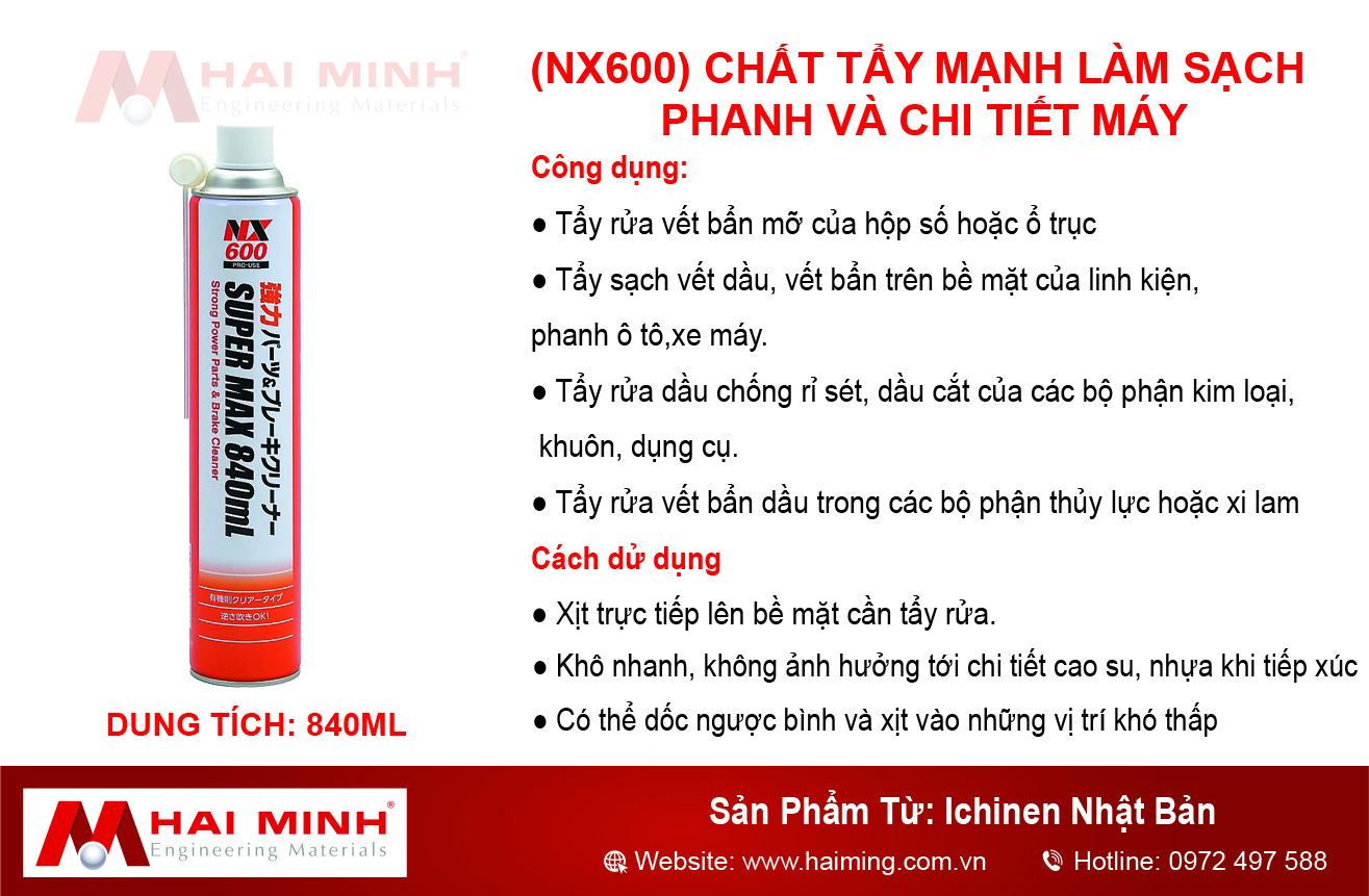 - Tên sản phẩm: Chất tẩy mạnh làm sạch phanh và chi tiết máy NX600